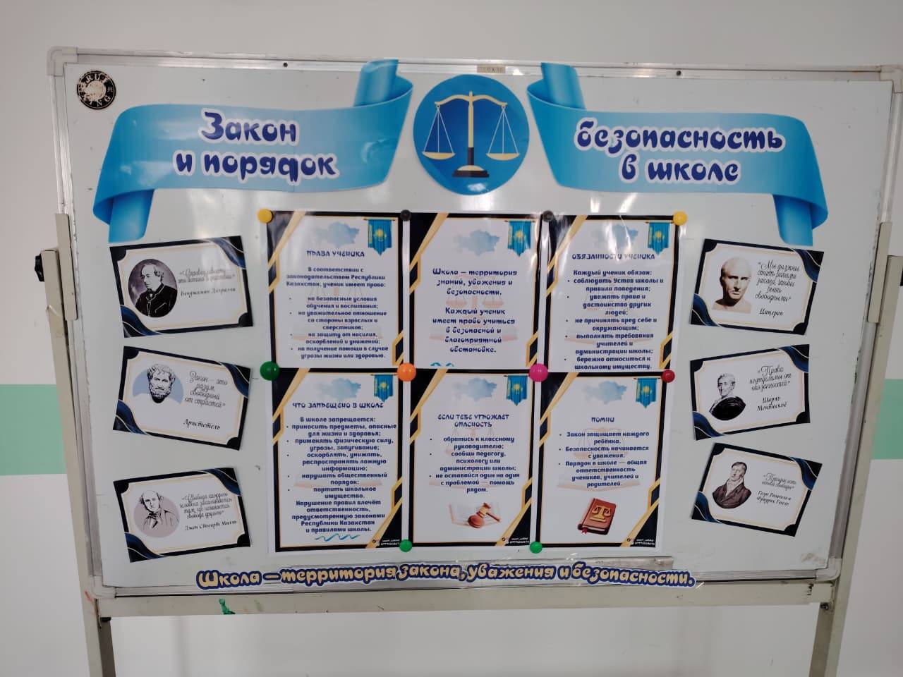 "Заң және тәртіп" айлығы аясында мектепте "өз құқықтарыңды біл", "Заң бұзылғанды ұнатпайды", "Менің өмірімдегі Заң және тәртіп"атты құқықтық бұрыштар рәсімделді