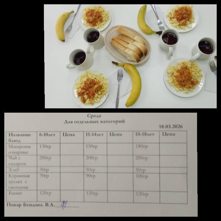 18.03.2026 жылы "Гусаков орта мектебі" КММ оқушыларының тегін тамақтануы бойынша түскі ас: қайнатылған макарон, көкөністермен тауық еті, нан, банан